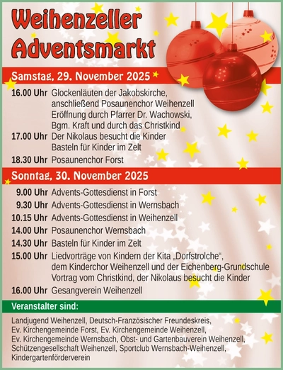 Der Adventsmarkt wird ausschließlich von unseren Vereinen und Organisationen durchgeführt. Neben den drei Kirchengemeinden Weihenzell, Forst und Wernsbach sorgen die Schützengesellschaft, der Kindergartenförderverein, der Sportclub Wernsbach-Weihenzell, der Obst- und Gartenbauverein, die Landjugend Weihenzell und der Deutsch-Französische Freundeskreis für ein abwechslungsreiches Angebot.