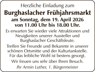 Am Sonntag, 19. April, ist es wieder so weit: Wie bereits auch in den vergangenen Jahren lädt Burghaslach zum Frühjahrsmarkt von 11 bis 18 Uhr mit einem bunten und vielfältigen Programm ein. Der Frühjahrsmarkt findet wie gehabt am Kirchplatz und in der Kulturtankstelle statt.