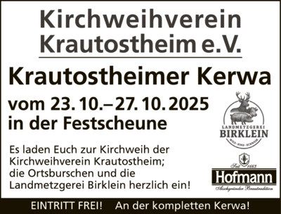 Auf geht’s zur Kerwa nach „Osta”: Im Sugenheimer Ortsteil Krautostheim wird vom 23. bis 27. Oktober 2025 Kirchweih gefeiert und das an fünf Tagen. Los geht es am Donnerstag mit Schlachtschüssel. Am Freitag ist Festbetrieb und Barbetrieb und das alles bei freiem Eintritt.