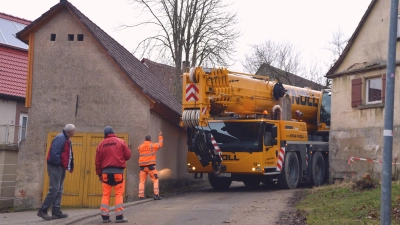 XXL-Fahrzeuge brachten am Dienstag die Teile für die neue Kleinkläranlage in den Uffenheimer Ortsteil - was nicht ganz einfach war.