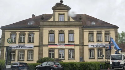 Zwei Installationen zum Jubiläum an der Rathausfassade sowie in der Vorderen Gasse sind deutlich sichtbar. Wie lange sie bleiben sollen, ist noch offen.