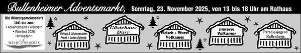 Herzlich willkommen zum Bullenheimer Adventsmarkt am kommenden Sonntag, 23. November 2025, von 13 bis 18 Uhr am Rathausplatz.