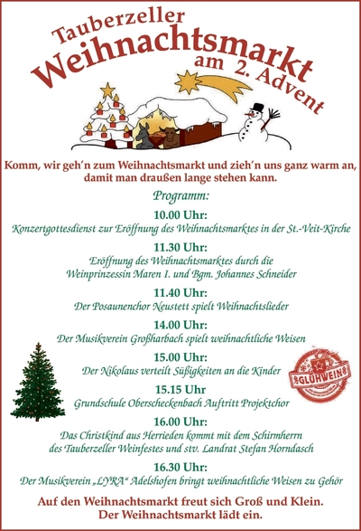 In diesem Sinne heiße ich Sie herzlich willkommen auf unserem stimmungsvollen Weihnachtsmarkt in Tauberzell. Ich freue mich, dass auch in diesem Jahr viele Gäste den Weg in unseren malerischen Weinort finden, um gemeinsam die Adventszeit zu feiern und sich auf das Weihnachtsfest einzustimmen.